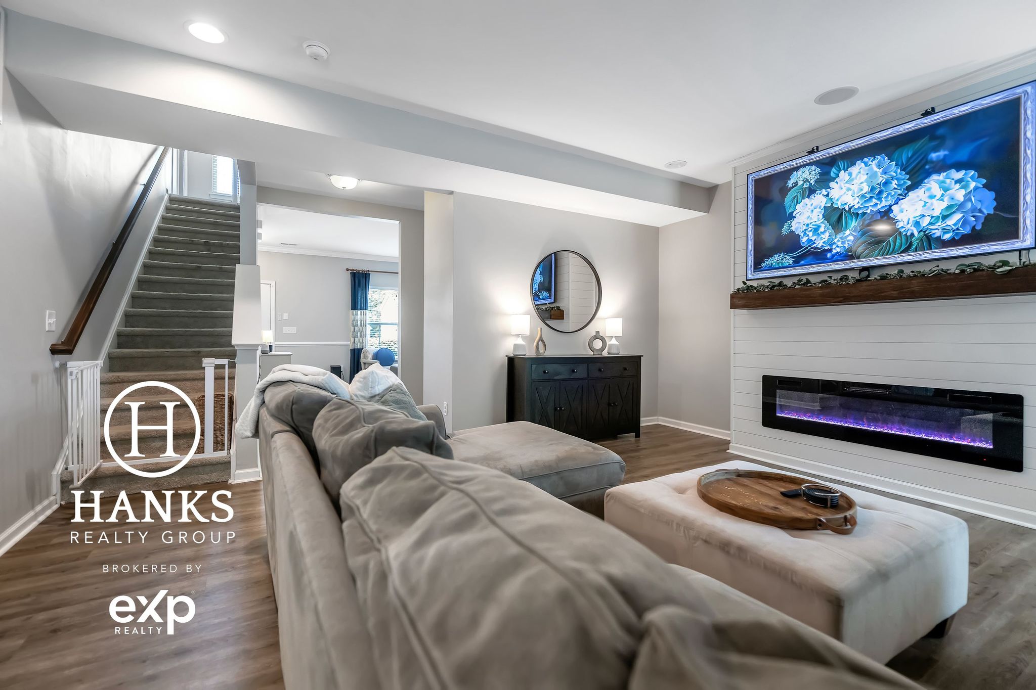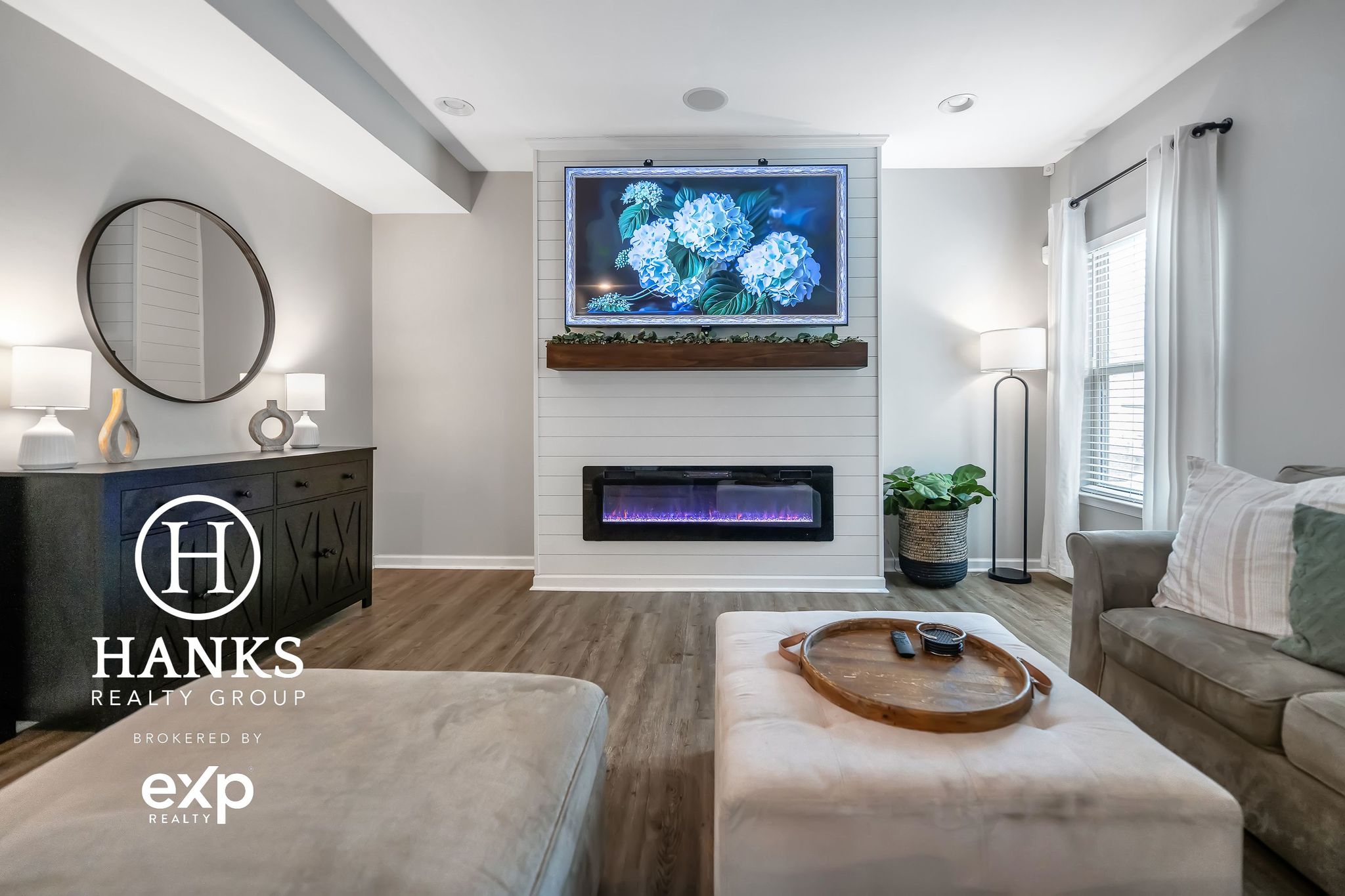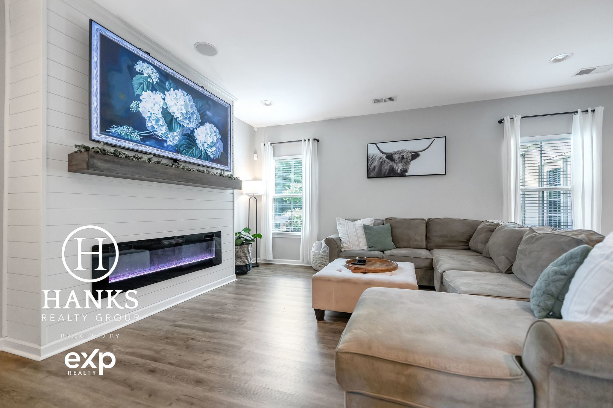 Stylish kitchen has stainless appliances, granite tops, subway tile, island, corner pantry, & the refrigerator stays! Adjacent dining/flex area overlooks private backyard. Living room highlights custom shiplap fireplace with flush-mount multi-light insert and heat-optional feature.